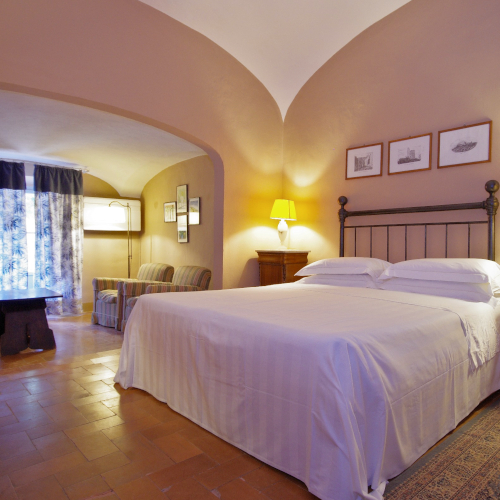 Camere Classic situate al primo piano dell’abbazia; ampie e con vista sull’affascinante giardino di Badia a Coltibuono o sul vasto panorama della valle dell’Arno. L’arredamento classico e le note di colore dei tessuti creano un’atmosfera intima e rilassante. Il bagno ha vasca con doccia. Su richiesta è possibile allestire due letti singoli.