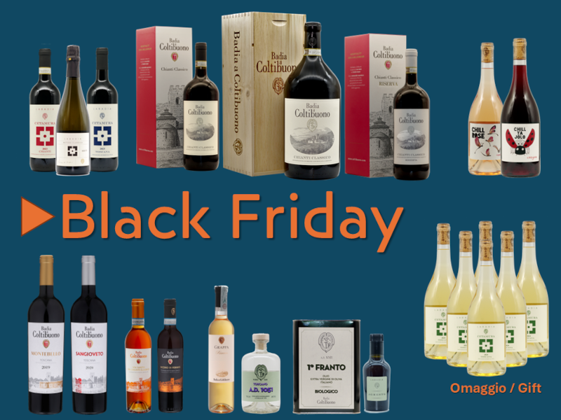 (*) al raggiungimento dei 200 € di spesa nel vostro carrello compirà il codice sconto “Blackfriday”. Con il vostro ordine verranno spedite anche le sei bottiglie omaggio di Cetamura Bianco Toscana I.G.T.